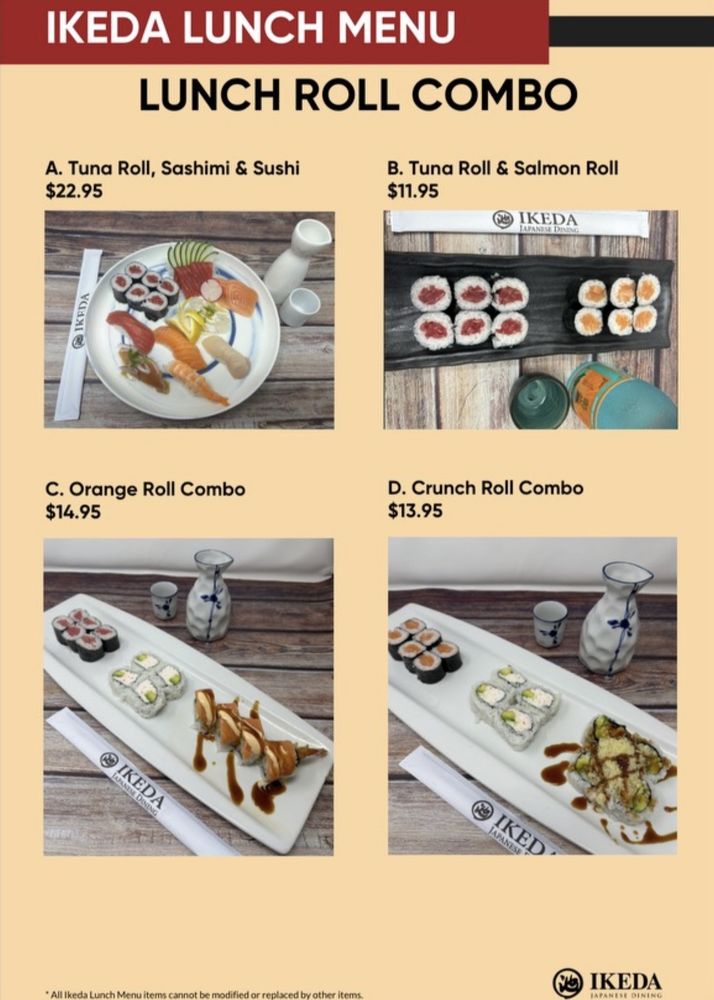 All orders served with Miso SoupStep #1 Choice of ONE Sushi or Sashimi Step #2 Choice of ONE Special Roll or Premium Roll* All Ikeda Lunch Menu items cannot be modified or replaced by other items.** Substitute soy paper for seaweed for $1 extra
